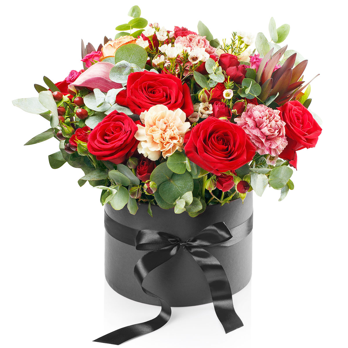 Роза одноголовая красная, роза кустовая красная, гвоздика персиковая и розовая, протея, калла розовая, ваксфлауэр, эвкалипт. Упаковка (шляпная коробка, квадратный бокс, коробка сердце, оазис)