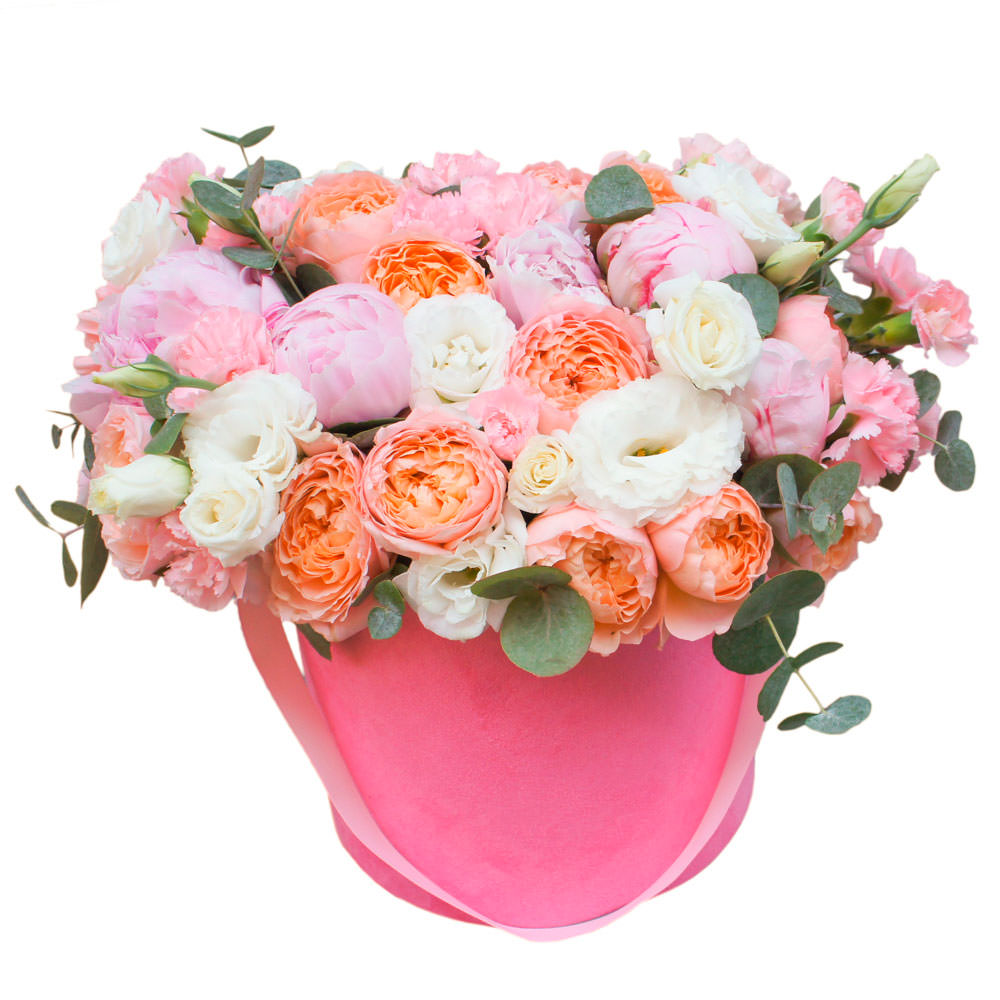 Пион розовая, роза пионовидная коралловая, эустома белая, эвкалипт. Упаковка (шляпная коробка, квадратный бокс, коробка сердце, оазис)